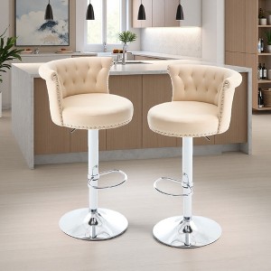 - (Modern Aesthetic): This modern counter stool is simple and elegant, featuring button tufting and a barrel curved backrest. Silver decorative studs around the cushion and backrest add extra flair to this bar stool.