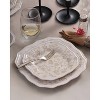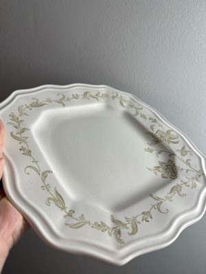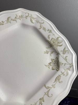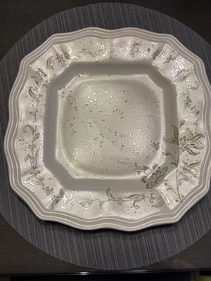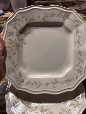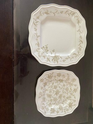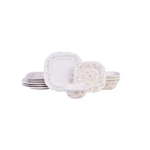 Add a touch of elegance to your table with this beautiful, unique dinnerware. Each piece has a beautiful floral design inspired by Indonesian folk art. The slightly transparent look of the intricate pattern gives it an heirloom quality. A unique scalloped square shape adds a touch of classic charm for this quality dinnerware.