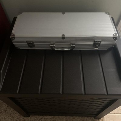 This resin storage bin is exactly what I thought it would be from the description. It is sturdy enough for me to sit on and big enough to store my dog towels. It is very inexpensive but looks fine on my side porch. I would choose a more expensive material for patio furniture but this meets the needs I have for storage in an inconspicuous spot.