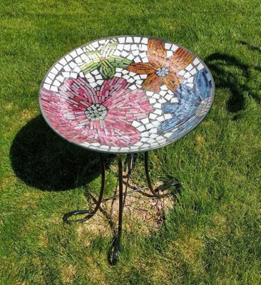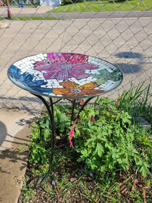 [This review was collected as part of a promotion.] This bright and colorful birdbath is a great addition to my little garden area where I have all my bird feeders set up. When it gets really hot here birds have resorted to drinking from the dogs water bowl. Now they have their own place to drink and cool off. The colorful mosaic design attracts them to it. It is 24 inches tall and sits on a cross legged base with rolled feet.