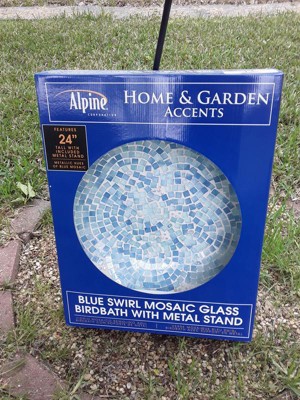 Provide a gathering space in your backyard for your feathered friends with the Alpine Corporation 24" tall Outdoor Mosaic Style Glass Birdbath Bowl with Metal Stand. This modern birdbath bowl with shimmering hues of blue mosaic glass provides a sanctuary for all types of birds, while adding colorful, mosaic style to your outdoor living space, yard, or lawn. Skillfully crafted from sturdy and resilient glass with an included metal stand, the 2" tall bird bowl is built for years of quality outdoor use. The sturdy and supportive legs provide stability for the bird bowl and prevents it from tipping over when multiple birds congregate on the basin’s wide, shallow bowl. Not only is the birdbath functional, it’s stylish as well and provides an elegant addition to your courtyard, patio, or yard. It will give your garden visual interest with its timeless design and artistic style. This compact, birdbath measures 18"L x 18"W x 2"H and the included stand measures 17"L x 17"W x 23"H (total height is 24") to fit almost any outdoor area and includes a one-year manufacturer's warranty from date of purchase. Alpine Corporation is one of America's leading designers, importers, and distributors of superior quality home and garden decor products. Alpine's award winning in-house design team continuously develops new and innovative "statement pieces" for your home and garden. Your outdoor living spaces will be the envy of the neighborhood with our wide assortment of fresh, fashionable and contemporary products, from beautifully crafted solar garden stakes featuring patented motion and fiber optic lighting technology to gorgeous glass and glow-in-the-dark birdbaths and feeders.
