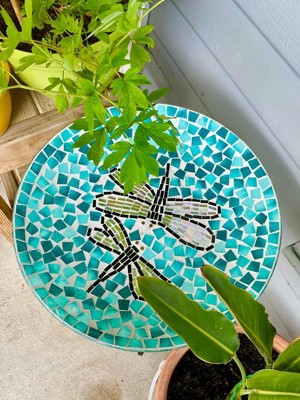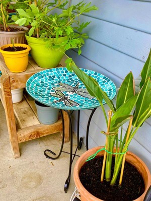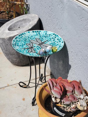 23" Outdoor Mosaic Dragonfly Glass Birdbath Bowl with Metal Stand Turquoise Green - Alpine Corporation