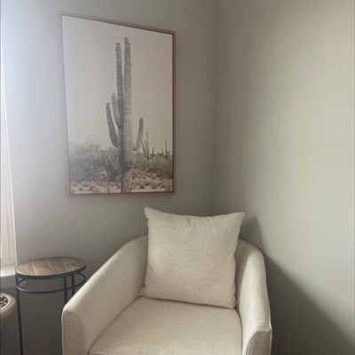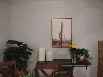 Create a beautiful Southwest vibe in your home with this cactus art by Amy Peterson. Framed in the USA in Waunakee, Wisconsin, this floating canvas art will be a pleasure to look at every day in your living room, bedroom, nursery, or any room in the home. Printed on gallery-wrapped canvas and framed with a lightweight polystyrene frame, this wall art has two hangers already attached to the MDF back for easy wall display. The outer dimensions are 33 inches tall by 23 inches wide by 1.63 inches deep. Print Name: “Sunrise Cactus”