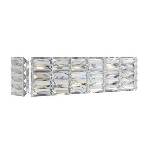 Crystal prisms are set like jewels into a long, glamorous vanity light with mid-century flair. Add vintage glam over a sink or vanity, for an Art-Deco-inspired bathroom. A sparking chrome finish makes this light perfect for contemporary bathrooms too. Give your bathroom vanity an instant glam makeover with the sparkle of real crystal and chrome. This 3-light fixture is perfect for a single sink in a large bathroom; or use one over each sink on a double vanity. Takes 3 bulbs and compatible with 5W LED or 25W Type "A" or 9W CFL. Eco-friendly 2W LED bulb included. As this fixture must be hardwired, we recommend a professional electrician manage installation. Color Temperature: 2700K. CRI: 82. Before cleaning any lamp shade or fixture, disconnect the power source. Wipe with a soft, dry cloth. Avoid the use of chemicals and household cleaners as they may damage the finish.