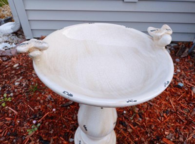 [This review was collected as part of a promotion.] This bird bath is a great addition to our yard decor. We tend to get a lot of birds who hang out in our trees and near our house. This bird bath is great so they have a close place to bathe rather than flying further. The whole thing comes in two pieces, which makes it much easier to store, but it has tabs so it hooks together securely. I appreciate that as winter settles in I need to bring it in safely but an awkward shape makes that difficult. So bring able to take it apart is a life saver. The whole thing has an older feel so it looks great and it fits in with most decor. The little birds on it are cute but not detailed so it won't scare some if the more skittish real birds who may visit. Looks great and holds up well outside. I am happy to have a beautiful piece of decor and the local birds are happy as well.