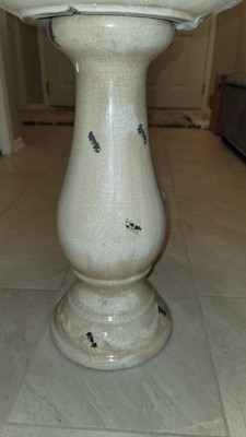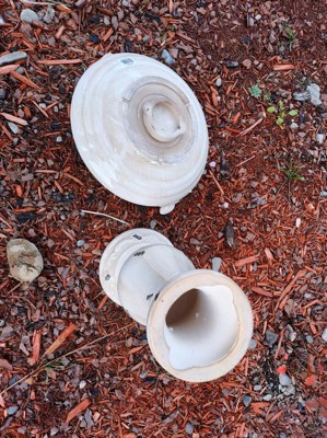 [This review was collected as part of a promotion.] I love this birdbath! Its so pretty and such amazing quality! It is very heavy duty ceramic with beautiful antique details. It comes in two pieces, the base and the top. The top interlocks with the bottom to keep it in place. It has cute little ceramic birds on the top on the rim of the birdbath. Its a very nice antique light brown and cream color and about 25 inches tall. It is recommended to bring in during freezing cold weather, living in the midwest this is important to know. I cant wait to watch the birds bathe in the bath come spring time!