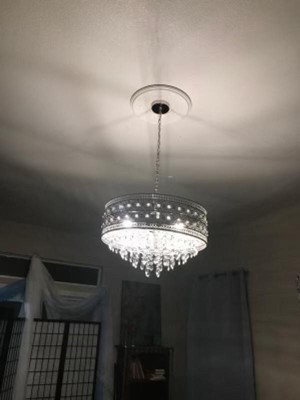 [This review was collected as part of a promotion.] This beautiful light fixture added a lot of glitz and glam to my small space. It's a showstopper. The installation was straight forward, with options to hang it lower with an included chain. I think it would work well with higher ceilings. There were a couple pieces missing from the one I was sent, I plan on using the longest center pieces as a replacement, so did not try contacting the company.