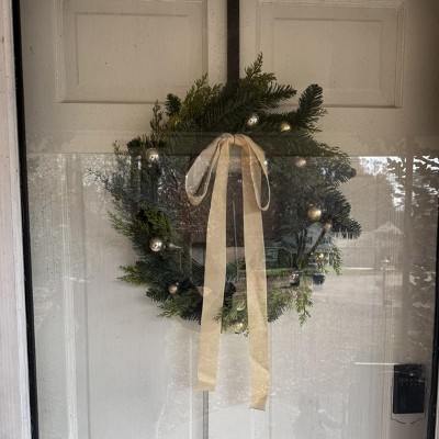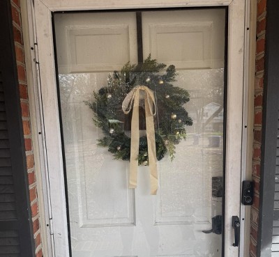 I really love it! This one drew my attention first, but then I was unsure looking at the prelit with red bow. I’m so glad I chose this one. It’s so pretty. Don’t mind my door that needs to be repainted haha but it’s a beautiful wreath, classy looking, inexpensive, and requires very little fixing of branches and ornaments.
