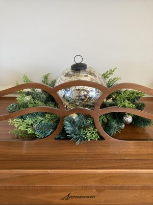 We use this ornament wreath inside, displayed on top of our piano, with other ornaments around it. It is beautiful! I did decide to cut the bow off, but that's just my preference. So glad I got this wreath! The different colors of greenery add a lot of aesthetic appeal. Initially, I thought it was a little expensive, but I was able to get it for a Black Friday deal.