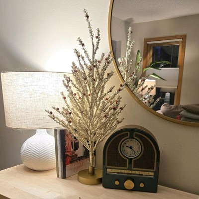 This 24-inch tall Decorated Gold Tinsel Artificial Tree from Threshold™ adds a shimmering pop of festive charm to your holiday decor. This artificial Christmas tree features gleaming gold tinsel branches dotted with sparkly red ball ornaments for a beautiful look. It stands atop a shiny round pedestal base, making it perfect for tabletops, mantels, or smaller spaces where you want to create festive ambience with a dash of dazzle.