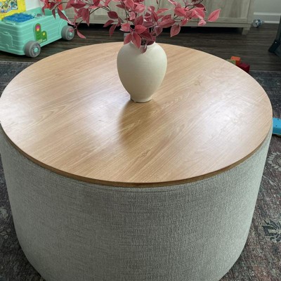 Our Storage Ottoman with Wood Top in stain-resistant cream woen offers a sleek, modern design with functional storage. Use it in your living room or family room to contain controllers, remotes or toys or place it in your bedroom to store extra pillows or blankets. Two paired together doubles the impact wherever you need it most! Easy to assemble and maintain. Spot clean only. Please note that fabric and wood colors may appear slightly different due to variations in lighting or screen settings.