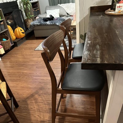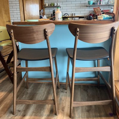 I love the style of these chairs and they are really comfortable for counter stools. They were relatively easy to put together- took about 1 hour for my husband and I to assemble. A good drill is a must to get the seats attached to the chair as there are no pre drilled holes for this part. I gave them 4 stars because the legs were scratched and some blue paint was on the back straight out of the box-see pics. Overall we love the chairs and we have toddlers, so we kept them bc they will inevitably get some damage along the way with kids, lol.