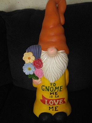 [This review was collected as part of a promotion.] I got the 24"H "To Gnome Me Is To Love Me" Indoor/Outdoor Garden Gnome Statue, Orange/Yellow and Im in love with it. The colors are awesome and its just adorable. Bigger than i expected. It looks amazing in my outdoor garden.