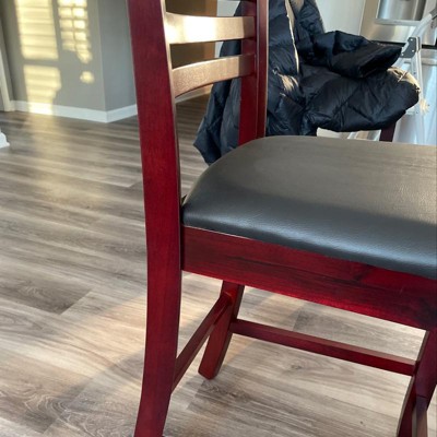 Elevate your kitchen or home bar with the sleek and stylish Torino Merlot Ladder Counter Stool. Crafted from sturdy solid rubberwood and featuring a rich merlot finish, this counter stool is designed to complement a variety of décor styles. The ladder-style backrest and padded seat, covered in easy-to-clean faux leather, ensure both comfort and convenience. Whether you're entertaining guests or enjoying a casual meal, the curved back and footrests provide ample support, making this stool ideal for long periods of use. With a 24-inch seat height, it pairs perfectly with bar counters ranging from 35 to 39 inches tall.