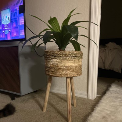 This planter is pretty rustic from the unfinished legs to the rope and grass rope that is wrapped around the plant. The artificial plant looks nice. Not really feeling the pot/planter. Would probably look good in a minimalist home.