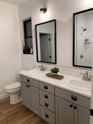 Beautiful mirror. Well constructed. I love the beveled glass. I’m giving 3 stars because I ran into issues installing. It has 2 D rings close to the edges. Instructions big and bold DO NOT USE PICTURE WIRE TO HANG. You are supposed to measure out perfect alignment and hang from these D rings using YOUR OWN screws and anchors. However, the placement was such, one D ring was in front of an electrical line. I couldn’t install an anchor, nor move the mirror to avoid. Frustrating. I wish they had alternate mounting methods. I ended up using 3 strand of picture wire and 2 picture hooks (good for 30# each) spaced 6” apart. It’s been 2 weeks and still going strong! You may want to consider having a handyman install. The 3 stars for design was mainly for design of mounting. There’s got to be a better way. I think this may be a bit too big for the space ( 30 wide cabinet. mirror 29.5 )