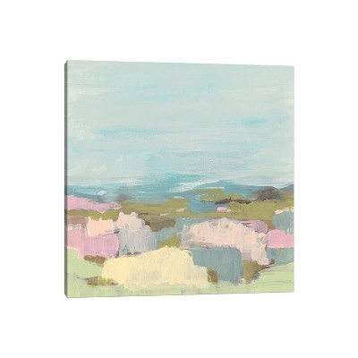 This ready to hang, gallery-wrapped art piece features a green landscape under a light sky. Giclee (jee-clay) is an advanced printmaking process for creating high quality fine art reproductions. The attainable excellence that Giclee printmaking affords makes the reproduction virtually indistinguishable from the original piece. The result is wide acceptance of Giclee by galleries, museums, and private collectors. Gallery wrap is a method of stretching an artist's canvas so that the canvas wraps around the sides and is secured a hidden, wooden frame. This method of stretching and preparing a canvas allows for a frameless presentation of the finished painting.