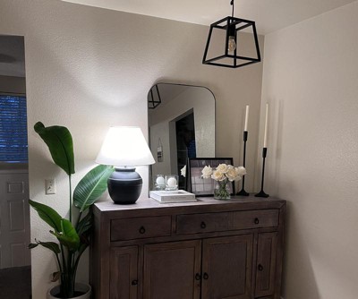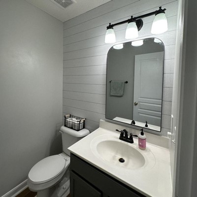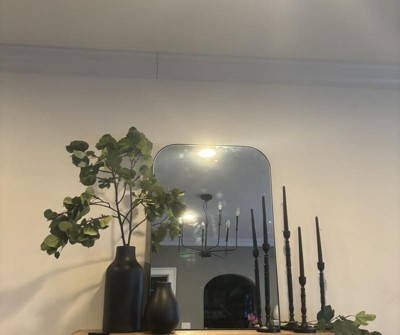 This mirror adds a modern touch to my living room. The rounded top and rust-resistant design are perfect. It's sturdy, stylish, and a great value!