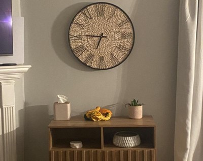 Place this wall clock on any wall in your living room, bedroom, or entryway, creating an eye-catching focal point that adds a bohemian charm to your space. Requires 1 AA battery, not included. This item ships in 1 carton. This clock has a brown rattan face with black roman numerals, and black hands. The clock mechanism runs silent. Can be hung horizontally using the hole on the back; nails and screws not included. Suitable for indoor use only. This item ships fully assembled in one piece. This is a single brown colored kitchen clock. Bohemian style.