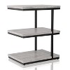 This handsome 2-tone end table with three levels of shelving features a mix of materials and hues that give any contemporary living space a warm, inviting appeal. The three shelves come in your choice of a walnut or light gray finish with rustic wood grain details for added style, complemented by the sleek metal frame and legs in black. This compact table has plenty of display space for a lamp, picture frame, candles, and more.