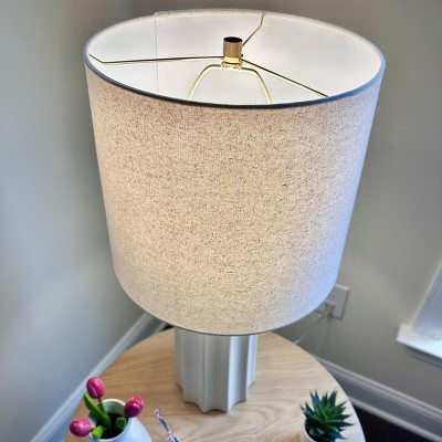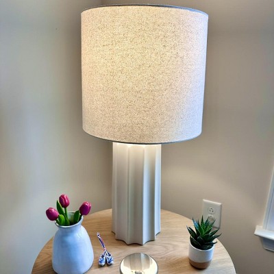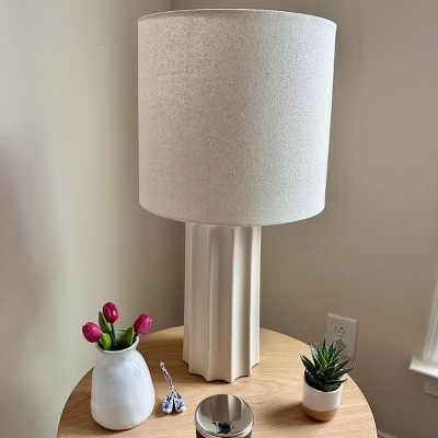 Light up your indoor setting with this Ribbed Ceramic Table Lamp from Threshold™. This ceramic table lamp makes a welcoming accent to your tabletop decor. It features a cream base with a vertical ribbed design for a chic, textured look. The white fabric shade completes the crisp modern look, while the on/off light setting with a rotary socket switch allows for easy functionality. Place it on any side table, console or sideboard for stylish, warm lighting.