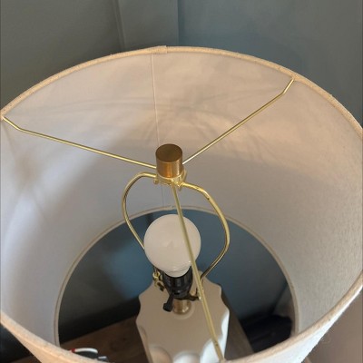 Beautiful lamp with a solid base and a light cream textured shade. There is gold on top . But the pickup was disappointing—no bag or box, shade zip-tied on, and one lamp was missing the top finial. The replacement they brought was damaged. Drive-up needs better quality control. Need to go inside and return immediately after picking up. Ridiculous waste of time.