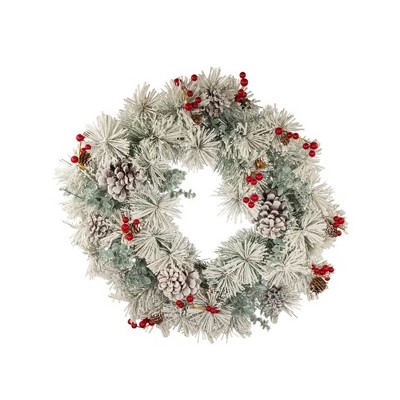 24 In Christmas Wreath,Pre-Lit Christmas Wreath with Lights & Bow & Bell,Berries & Pine Cones,Holiday Accent Decoration for Entryway Front Door