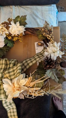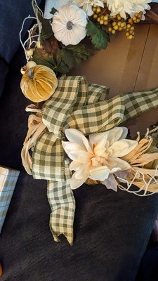 - This autumn floral wreath is with white pumpkins and dahlias, paired with green fern leaves, maple leaves and a white green checkered cloth band, capturing the essence of autumn in the most beautiful form.