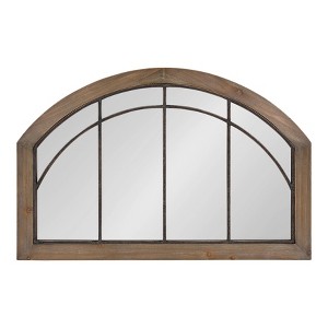 The Haldron Wood Arch Mirror embodies the casual feel of a timeless aesthetic. Our version of this traditional style mirror includes a decorative natural iron fretwork and a wide wood profile finished in a rustic brown. Meant to be hung horizontally, it will provide radiance while balancing a room's ambiance. The mirror's internal metal fretwork is an impressive detail inspired by a classical window design. It features a textured rustic finish that adds a dramatic touch to the interior metal design and mirror underneath. This decorative piece is a great addition to your traditional and themed rooms. It comes with metal D-ring hangers attached to the back for easy wall mounting. This wall mirror is ideal for above a sofa, over a mantle, or any wall space that needs brightening and interest. In entryways, bedrooms, or hallways this arched mirror will create a stunning reflective window wall. The outer display dimensions are 36 inches across by 24 inches high. Give your living spaces a visual makeover while illuminating the area with this beautiful arch mirror.