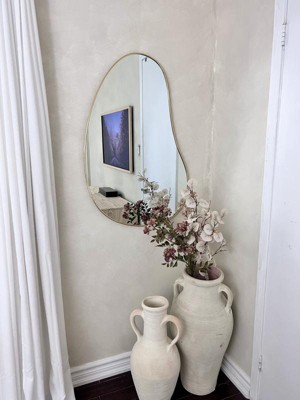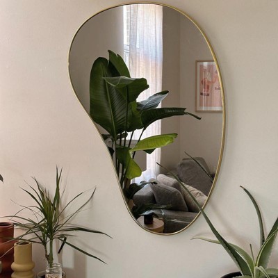 This unique, organic-shaped mirror is a new addition to our Hubba Family. With a special keyhole to help orient this mirror in 8 different ways, hang Pebble in a way that best fits your space. This playful mirror makes a perfect addition to a variety of spaces in the home - from entryway to bathrooms, playrooms and more. It measures 24 x 36 inches and has a thin, decorative metallic finished frame.