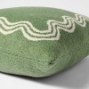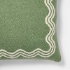 Spruce up the look of your space with this Jacquard-Knit Pillow with Scallop Pattern from Threshold designed w/Studio McGee. This 24-inch square pillow showcases a cream-color scallop pattern on a bright green backdrop, complemented by a solid green reverse for an elegant look. Featuring a 100% recycled polyester exterior and a well-filled interior, the jacquard throw pillow adds the perfect amount of comfort and style to your sofa, couch, bench or bed.