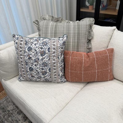 Spruce up the aesthetic and comfort of your home with this Uneven Plaid with Ruffle Pillow from Threshold™ designed with Studio McGee. This square throw pillow features an uneven plaid pattern with ruffle trim along the borders for an elevated look. The soft cotton-jute blend exterior and polyester filling offer plush comfort, while the hidden zipper closure gives it a sleek finish and makes it easy to remove the cover for cleaning.