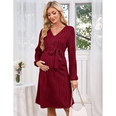 This long-sleeve maternity dress hits just above the knee and features a classic wrap-style closure and construction, a V-neck, and a tie closure along the waist to enhance a feminine silhouette. Perfect for a wedding guest or a night out.