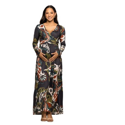24seven Comfort Apparel Maternity Green Paisley Print Long Sleeve Side Slit Maxi Dress