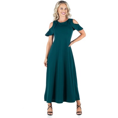Womens Ruffle Sleeve Cold Shoulder A-Line Soft Flare Maxi Dress - 24seven Comfort Apparel™