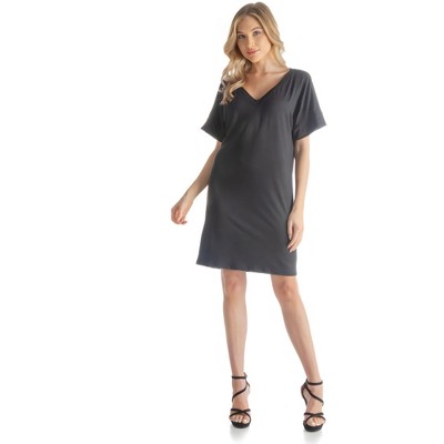 Step out in effortless style with this knee length T-shirt dress from 24seven Comfort Apparel, designed to combine chic sophistication with all-day comfort. Featuring a flattering V neckline and a loose, flowy fit, it drapes beautifully on every body type. Perfect for casual days or dressier evenings, it layers easily and is machine washable for easy care.