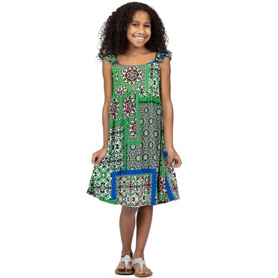 Get ready to take summer style to new heights with our Girls Green Scarf Print Side Slit Maxi Dress. Its not just a dress its a statement piece that is bound to turn heads and steal the show. With its sleeveless design and playful side slit, this maxi dress is all about comfort and flair. Picture your little fashionista twirling in the summer breeze with its flowy maxi length, while the vibrant green scarf print adds a touch of whimsy to every step. The round neckline ensures a timeless silhouette, making it perfect for any occasion. Whether she is exploring the beach or enjoying a picnic in the park.