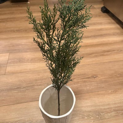 [This review was collected as part of a promotion.] The 25 inch length is long enough to be impactful in a arrangement and can be cut down. The cedar stem has a rich green hue and realistic branch structure that give it a natural airy appearance. As an indoor only piece, it’s super low maintenance- no water needed and super durable to withstand the hands of a toddler. It’s a great value for the price point. Hearth and hand makes great products!