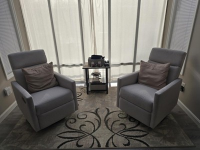 I bought two of these chairs for my sunroom, and I absolutely love them. They let me rock, recline, and even swivel a full 360 degrees. After comparing a lot of options, I think these are priced really well-they offer the best value I could find with all three features combined. The chairs are comfortable, though I'd recommend using a small pillow for lower back support if you like extra cushion. Every time someone tries them out, they end up asking where I got them and how much they cost. Definitely recommend!