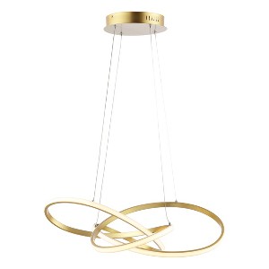 Intertwined curves of LED lights emitting from gold-painted iron create a look that is soft and elegant from materials traditionally known for their industrial strength. At 25" in diameter, it is stunning over a wood dining table, or incorporated as a way to soften industrial decor. With 36 watts of integrated LED lights, it is bright enough for a kitchen, but elegant enough for a living room, making it a versatile selection for anywhere in the home.