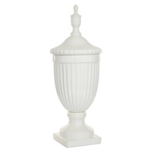- •Large urn and lid with a glossy white finish, finial top, textural vertical ridges, decorative block base