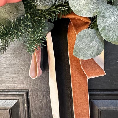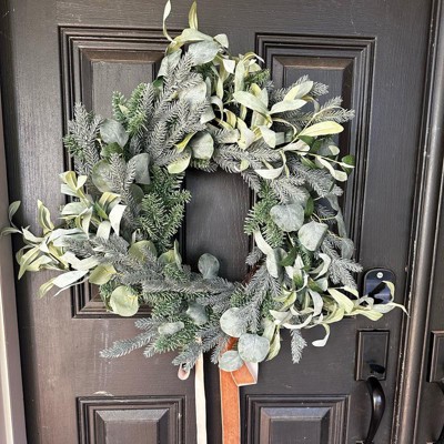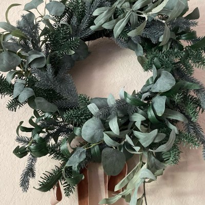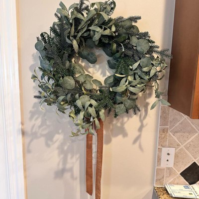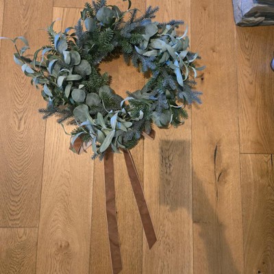 Bring the fresh beauty of the season to your home with this 26-Inch Olive and Pine Holiday Wreath from Threshold™ designed with Studio. This round wreath is densely covered with artificial olive and pine leaves in verdant green and adorned with a brown velvet-finish bow with trailing ties at the bottom, filling your space with beautiful, celebratory vibes. Featuring a convenient hanging loop, this Christmas wreath is perfect for creating an elegant focal point in a window, across your front door, or above the mantelpiece.