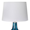 Curate a calming environment with the ambient diffused light of an expertly crafted table lamp; This stunning mix of materials and textures brings warmth and serenity to a space of any style from coastal to modern. Deep blue glass table lamp with metal accents and a white empire shade. Equipped with a rotary switch.
