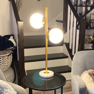 - This Art Deco-inspired orb table lamp has a brass finish and frosted glass globes for bright ambient light.
