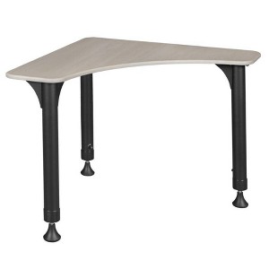 This Boomerang Height Adjustable School Desk is ideal for rooms with students of all ages. Kee adjustable post legs come four to a set and are height adjustable to accommodate students of all ages. Height is easy for adults to adjust by loosening and tightening a bolt with the included hex key. This 28-inch by 28-inch student desk assembles in a snap with just a few screws. The desktop is finished in an attractive Maple. Its rounded corners make the table safer for everyone. A sleek alternative to pedestal style bases, the adjustable post legs come in a classic black with chrome underneath. Adjustable glides on the bottom of the base ensure a level desktop and are easy to adjust.