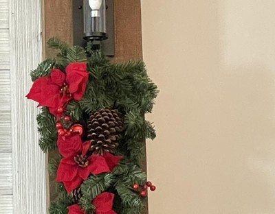 This decoration is really pretty. It’s the perfect size for where I wanted to use it, on a half door. I love the colors they are deep and pretty. It looks great and was easy to make it stay in place. Perfect holiday decoration.