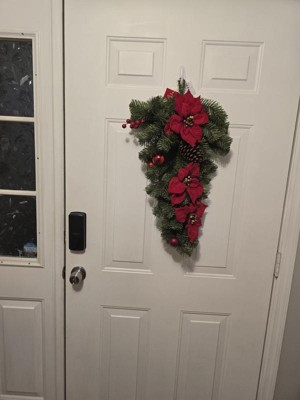 This decoration is a good size and a fun shape, a nice change from the standard round wreath. It seems well made and the colors are vibrant. I like the size of the flowers, and the whole thing is great way to bring a festive vibe. My only complaint is that some of the additional accents (pine cones, berries) aren’t evenly distributed. The whole upper right side of it is lacking anything and is just greenery.
