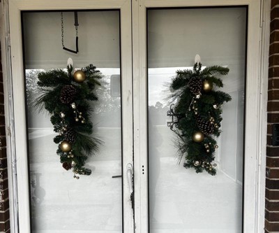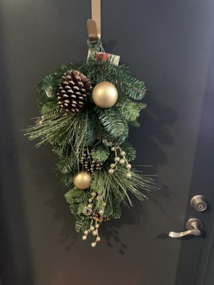 This triangular holiday spray is perfect for our home right by the doorbell. The pine boughs look real. The pine cones and ornaments give it just the right holiday decor with just enough glitter to add sparkle without overdoing it. The only thing I will add is a battery operated light string to the display. But it is lovely as it is and puts us in the holiday spirit