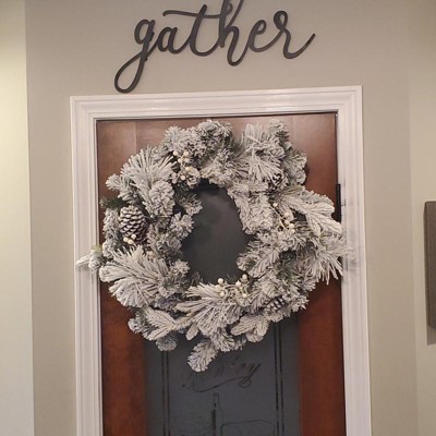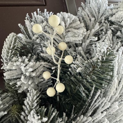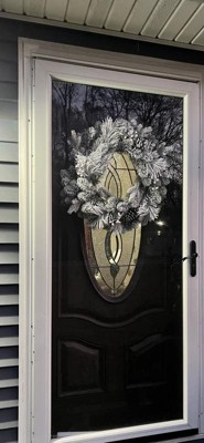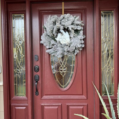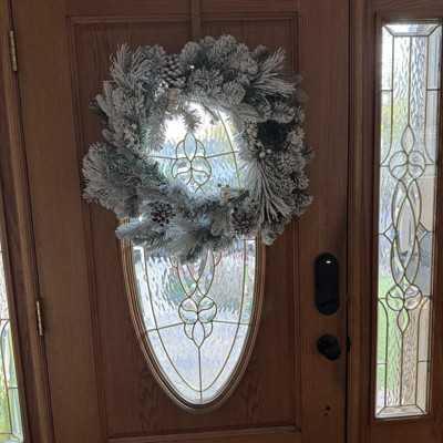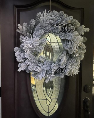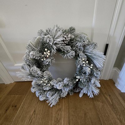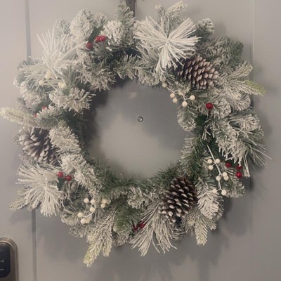 [This review was collected as part of a promotion.] This twenty eight inch flocked wreath is absolutely gorgeous! They did not hold back with the flocking of this wreath and I was not mad about it! The pine cones and white berries were a great detail to the wreath. It was the perfect size for my door as it was thin enough to close the door, but also big enough to make a statement and welcome the cold winter months ahead! I received an incentive to write this review.