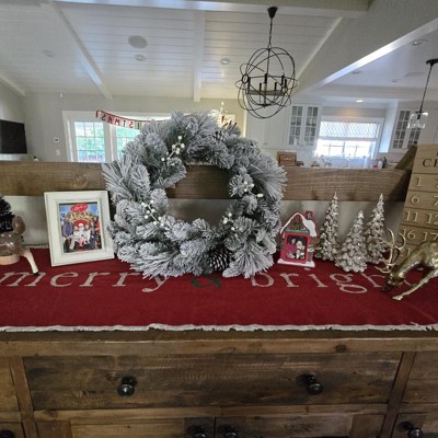 Add snowy charm to your festive decor with the 28-Inch Flocked Mixed Greenery with Berries and Pinecones Artificial Christmas Wreath from Wondershop™. This round artificial Christmas wreath is decorated with flocked mixed tips, faux pinecones and berries for Christmasy vibes. This ready-to-use wreath can accent your front door, wall or window with ease.